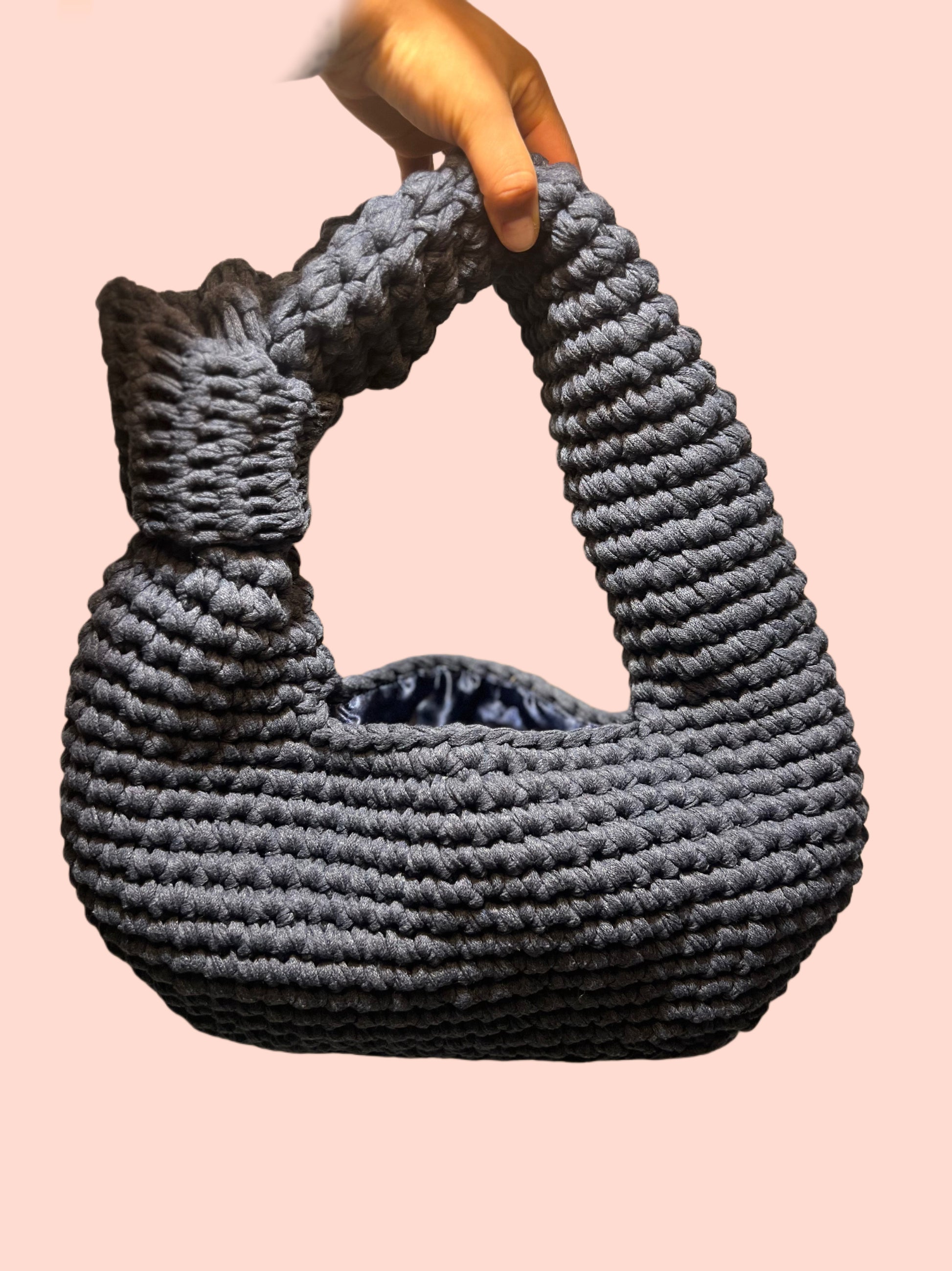 Satin-lined, navy blue crochet bag that fits on your shoulder and holds all the essentials. Cotton blend yarn. Hand wash only, lay flat to dry. Handle with care, love for a long time :).